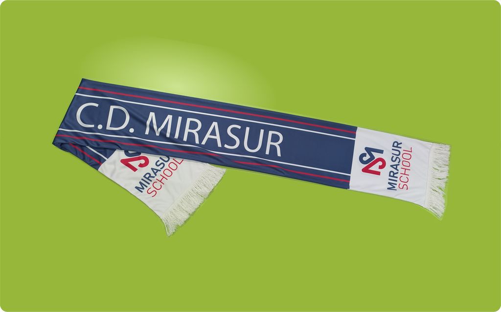Bufanda 100% poliéster tejido liso satén y flecos de algodón, con doble capa sublimada y visible por los dos lados. Medidas 20 x 150 cm. Abrígate y anima a tus compañeros y amigos.